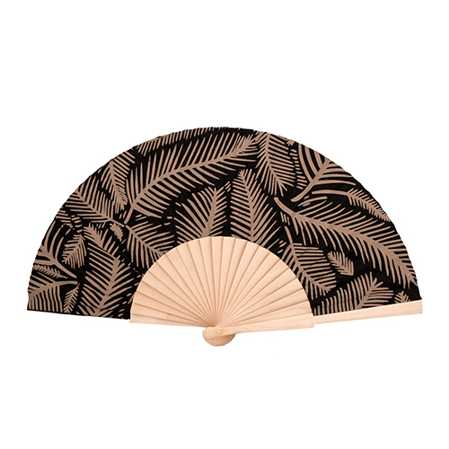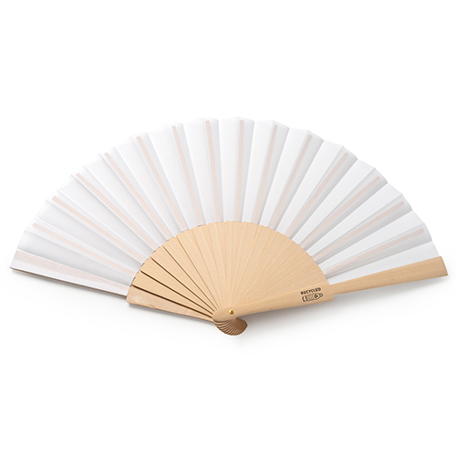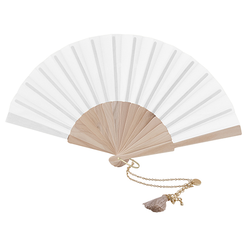 Ventaglio da 23cm con stecche in legno e pavese in poliestere. Decorato con un laccetto e un pompom. Fornito in confezione in cartoncino avana. .