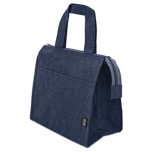Borsa termica realizzata in RPET. Ampio scomparto principale con rivestimento interno isotermico e chiusura con zip. Tasca frontale aperta. Pratici manici er il trasporto. Etichetta esterna RPET.. . 22 x 22 x 12,5 cm