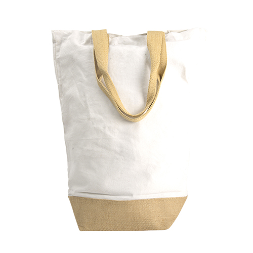 Sacca mare realizzata con un mix di materiale, corpo in cotone e parte bassa in juta, manici lunghi rinforzati in cotone color naturale. Chiusura con bottone magnetico.. . 53 x 39 x 19,5 cm
